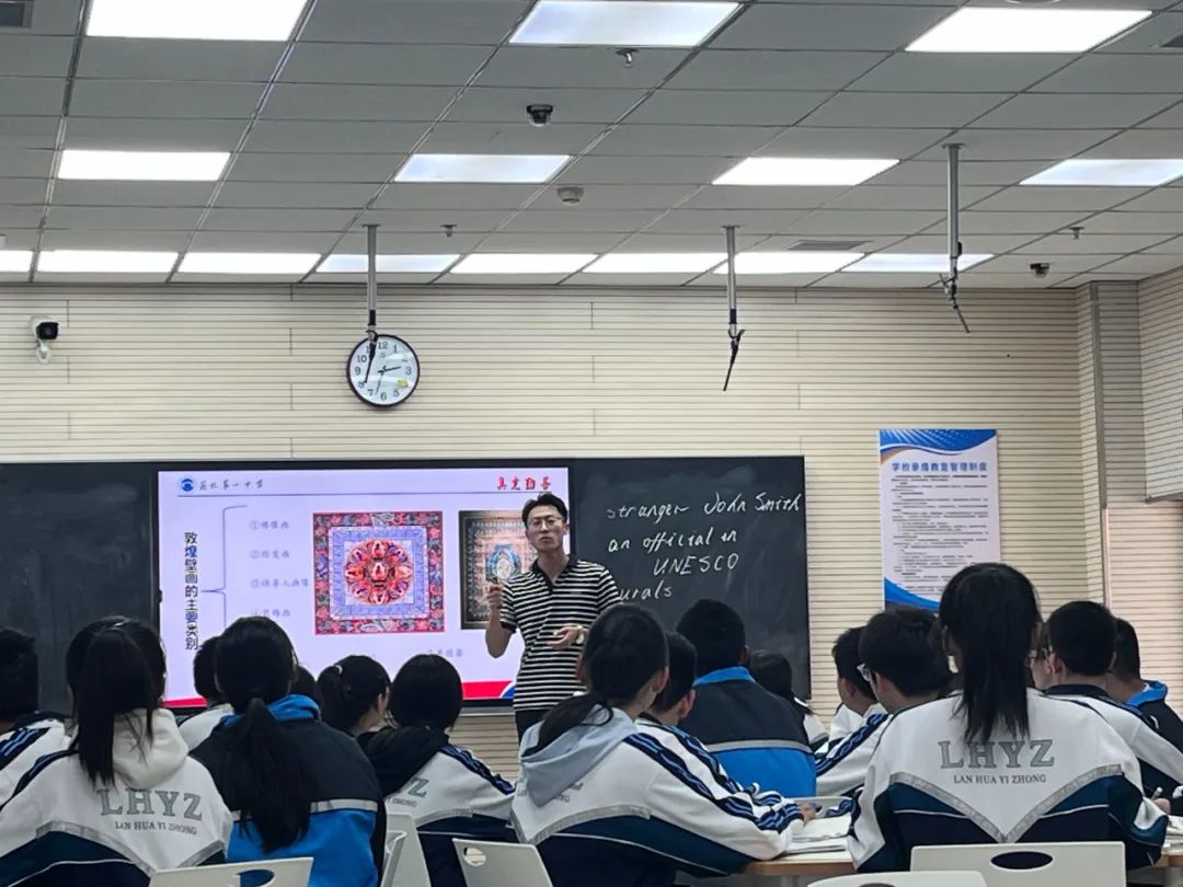 在教学主体环节,美术教师邸金龙首先登场,从专业角度深入浅出地讲解了敦煌壁画的构图法则、色彩运用、绘画技法等艺术特色。通过中西壁画对比,配合生动的解说,让学生直观感受到敦煌艺术“天衣飞扬,满壁风动”的独特魅力。随后,英语教师接过教学接力棒,引导学生运用写作结构,语言知识,对壁画的艺术特点进行英语描述和写作训练,实现了从艺术鉴赏到语言输出的自然过渡,将课堂有机串联起来。